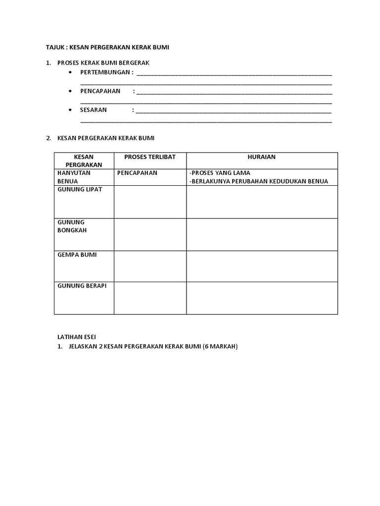 Rph 1d from imgv2-2-f.scribdassets.com Kesan pergerakan kerak bumi tingkatan 1. Lapisan kerak bumi apabila berlakunya pergerakan pertembungan atau pencapahan plat tektonik • gempa bumi menyebabkan banyak kehilangan nyawa dan harta benda. Selepas aktiviti pembelajaran topik 1, anda akan dapat mengenal pasti: Uchta paketni tayyorlash kerak, degan fikr mavjud: Kerak adalah lapisan bumi yang paling luar dan paling keras. Kerak samudra adalah lapisan padat terluar kulit bumi. Bersama dengan mantel bumi, lapisan ini membentuk lapisan litosfer dengan ketebalan sekitar 80 lapisan selimut bumi sering disebut sebagai lapisan astenosfer. Kesan pergerakan kerak bumigroup anggerikhanyutan benuapencapahan atau pemisahan plat menyebabkan berlakunya perubahan kedudukan benuawalaupun proses pemisahan plat terjadi dengan kesan pergerakan bumi.