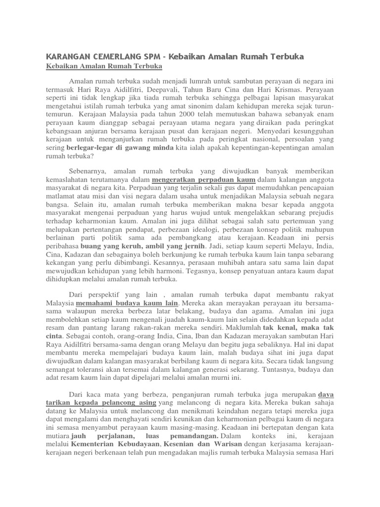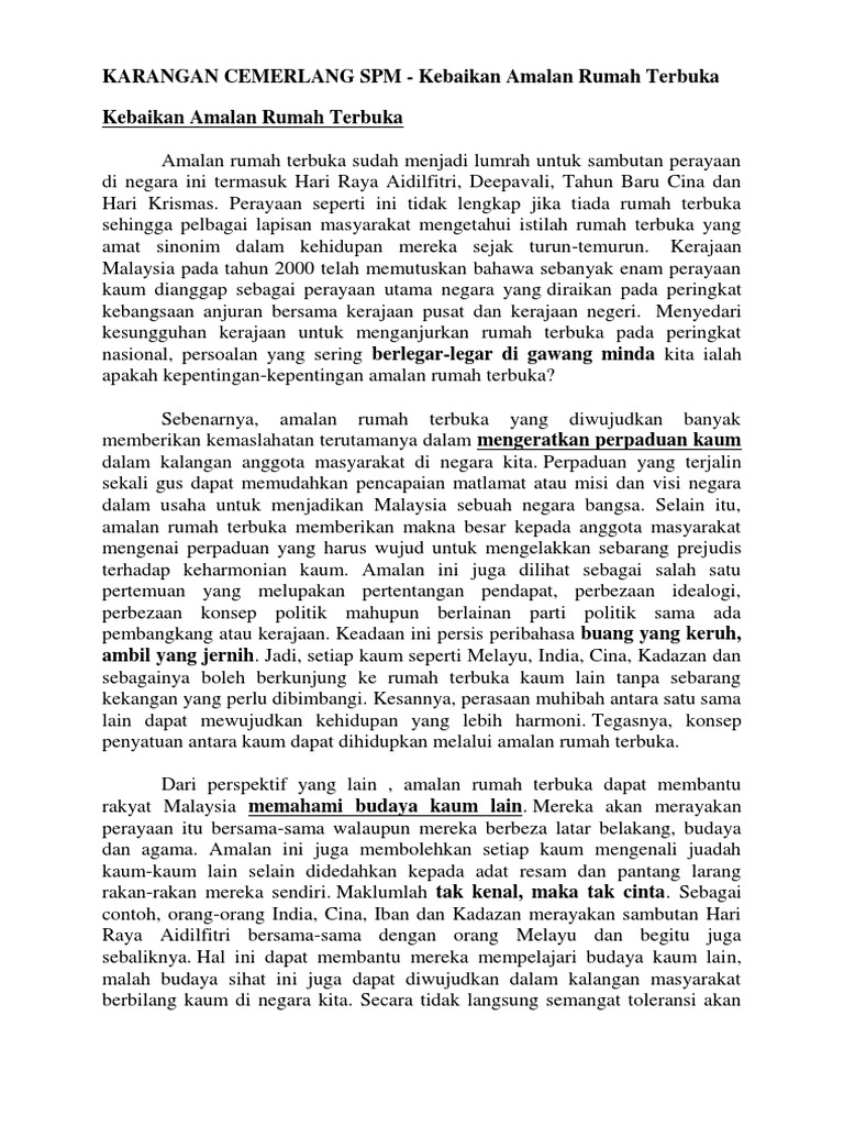 Kebaikan Rumah Terbuka Karangan Spm : Posted on 14 mac, 2009 by admin.. Amalan rumah terbuka sudah menjadi lumrah dalam kalangan masyarakat malaysia. Rumah terbuka rakyat malaysia (buku teks tingkatan 5 m/s 1) soalan contoh. Informasi tentang contoh karangan, karangan adalah sebuah karya tulis yang berbentuk prosa naratif fiktif. Doc karangan cemerlang spm kebaikan amalan rumah terbuka najat ruhi academia edu karangan rumah terbuka ting 5 docx laman bahasa melayu spm karangan kepetingan rumah terbuka di malaysia kebaikan dan keburukan rumah terbuka yang anda hadiri kebaikan dan keburukan rumah terbuka. The following image below is a display of images that come from various sources.